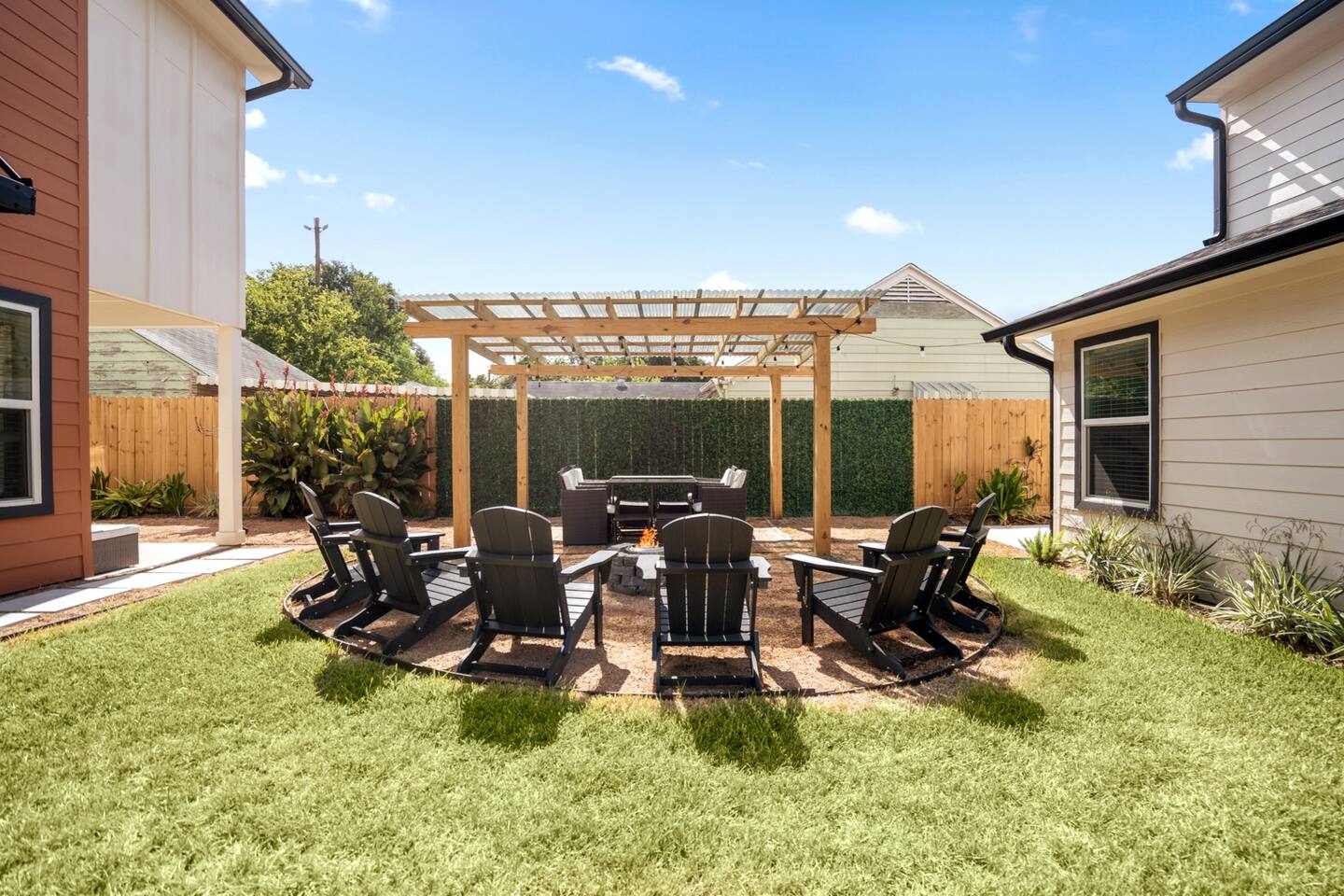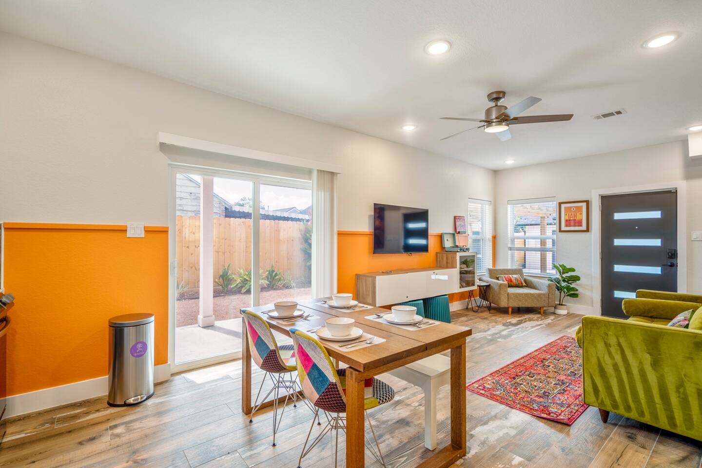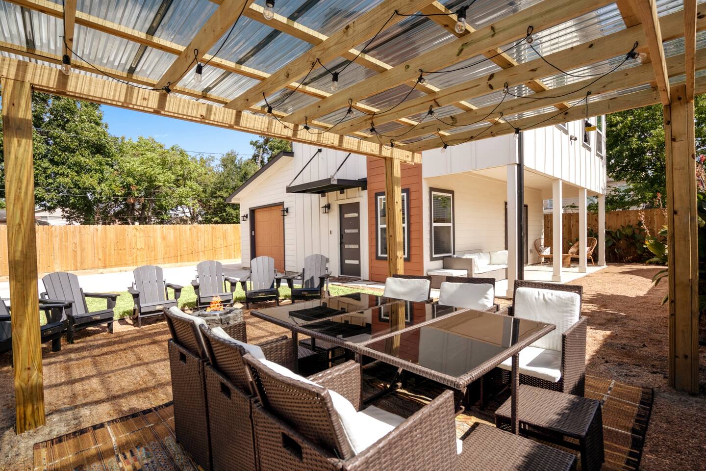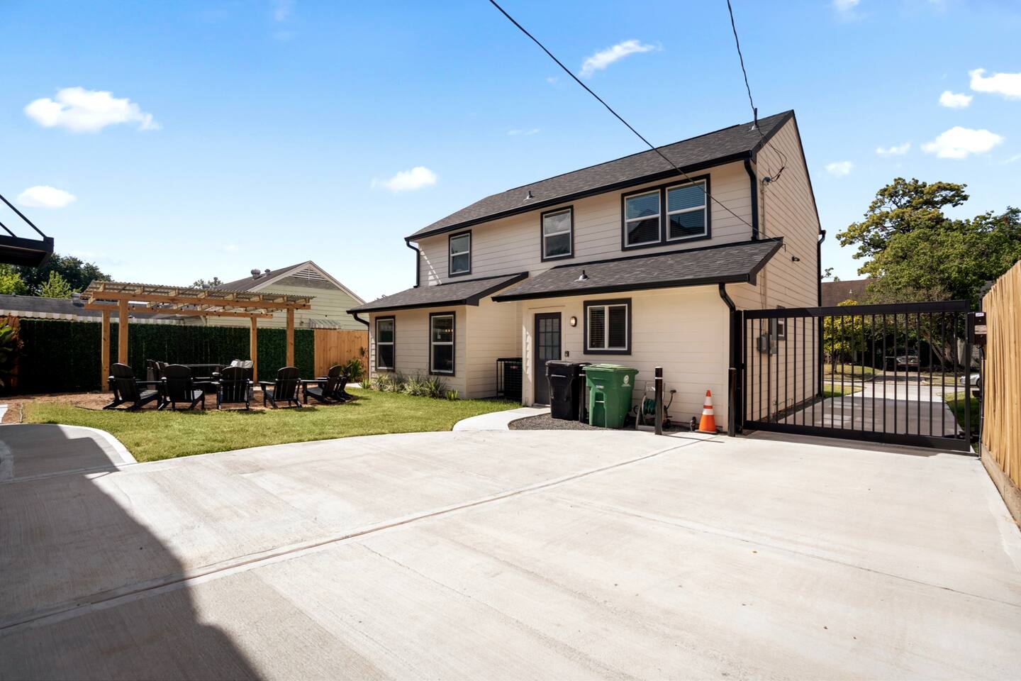 This property contains 2 separate living units on one lot. This listing is for the both the primary home located in front and the ADU in back. PRIMARY HOME: -- Guest Bedroom #1 Queen Bed w/ Private Bathroom – (Sleeps 2) - DOWNSTAIRS -- Guest Bedroom #2 King Bed w/Private Bathroom – King bed (Sleeps 2) - UPSTAIRS -- Guest Bedroom #3 w/Private/Semiprivate Bathroom - King Bed (Sleeps 2) - UPSTAIRS -- Flex Space - w/Semi-Private Bathroom Double Twin Day Bed (Sleeps 2) - UPSTAIRS BACKYARD ADU: -- Guest Bedroom #1 Queen Bed w/ Private Bathroom – (Sleeps 2) - UPSTAIRS -- Guest Bedroom #2 King Bed w/Private Bathroom – King bed (Sleeps 2) - UPSTAIRS -- Living Room Pullout Sofa Queen Bed - DOWNSTAIRS (Sleeps 2). Semiprivate Bathroom -UPSTAIRS ***FEATURES*** ✔ Welcome Snacks ✔ Fully Equipped Quartz Countertop Kitchen ✔ Keurig coffee maker, coffee, teas, sugars, creamer ✔Stainless Steel appliances ✔ Hi Speed Wifi ✔ HD Smart TVs conveniently located in every room ✔ Free On Site Parking ✔ Private Laundry Room with large capacity washer/dryer ✔ Board Games ✔ Arcade games ✔ Record Player ✔ Backyard oasis ****CENTRALLY LOCATED!!**** 0.3 miles (2 min) to University of Houston 0.2 miles (2 min) to Texas Southern University 3.3 miles (11 min) to Rice University 3.5 miles (10 min) to Texas Medical Center 3.1 miles (8 min) to Downtown Houston 3.1 miles (9 min) to Minute Maid Park (Astros) 2.6 miles (8 min) to Toyota Center (Rockets) 6.4 miles (13 min) to NRG Stadium (Texans) 3.2 miles (10 min) to George R. Brown Convention Center 3.2 miles (8 min) to Museum District 3.5 miles (8 min) to Houston Zoo 8 miles (16 min) to Hobby Airport 24.2 miles (27 min) to George Bush Intercontinental Airport